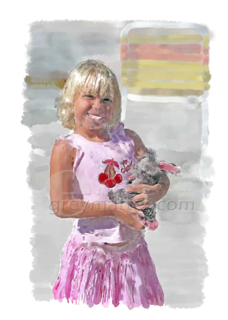 Digital watercolors are hand-painted using Photoshop™. Beginning with a photo, I first draw the major contours using a Digitizing Tablet and Sketchbook Pro™. I import this 'pencil sketch' into Photoshop. Then sampling colors from the photo, each stroke is hand-painted on the digital tablet in Photoshop. As a final step an overlay is added for the watercolor texture.